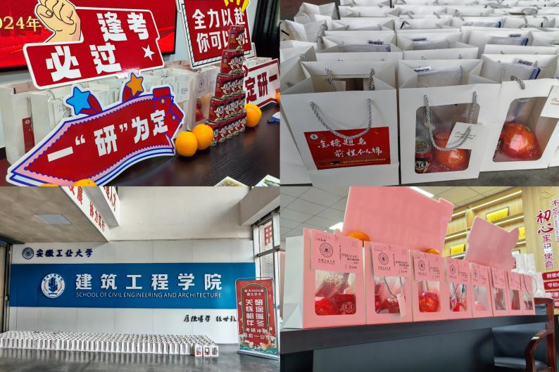 logo的手提袋、元气满满的“金榜题名”旺仔牛奶、心想事“橙”、考研文具包和毕业班辅导员亲手为每一位同学撰写的考研加油明信片。每一份“加油包”都饱含了学院对考生们满满的祝福与期待,表达了学院的关怀和美好祝福,坚定了同学们的信心。随后,学院领导给部分考研学生代表、毕业班辅导员给每位考研同学发放“考研加油包”。