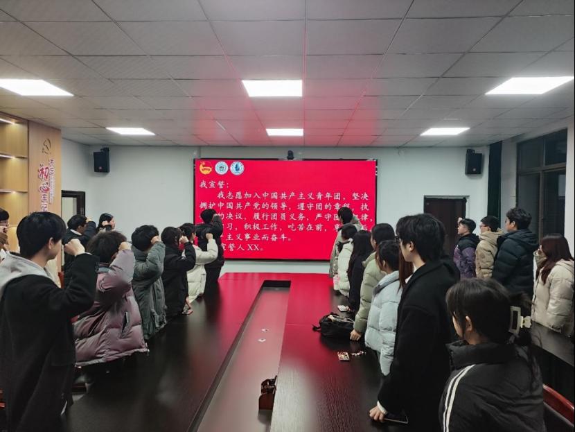 团委举行新团员入团仪式。学院团委书记崔余龙、团委副书记陈奎以及全体新团员参加。