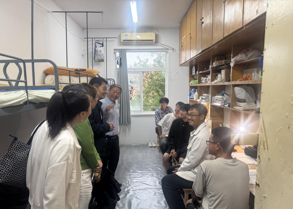 走访过程中,蔡保兴与张虎书记、王颖之副书记一行轻步走进新生宿舍,首先仔细查看了宿舍的居住环境,从床铺设施、采光通风到水电安全、卫生状况,逐一细致询问,确保新生拥有安全、舒适的生活空间。“来自哪个省份?”“寝室关系相处的怎么样?”蔡保兴以亲切的问候打开话匣子,用自己多年的教育工作经验与新生们拉家常,耐心倾听新生初入校园的感受,鼓励新生们珍惜大学时光,打好专业基础,在实践中锤炼本领。张虎书记则围绕学业规划与校园生活为新生们提供指导,王颖之副书记重点关注新生的生活需求与心理适应情况,她详细告知新生学院的资助政策、心理健康服务渠道及各类生活服务资源,让新生们感受到“有困难找学院” 的安心与温暖,同时叮嘱辅导员要持续关注新生动态,及时为新生排忧解难。