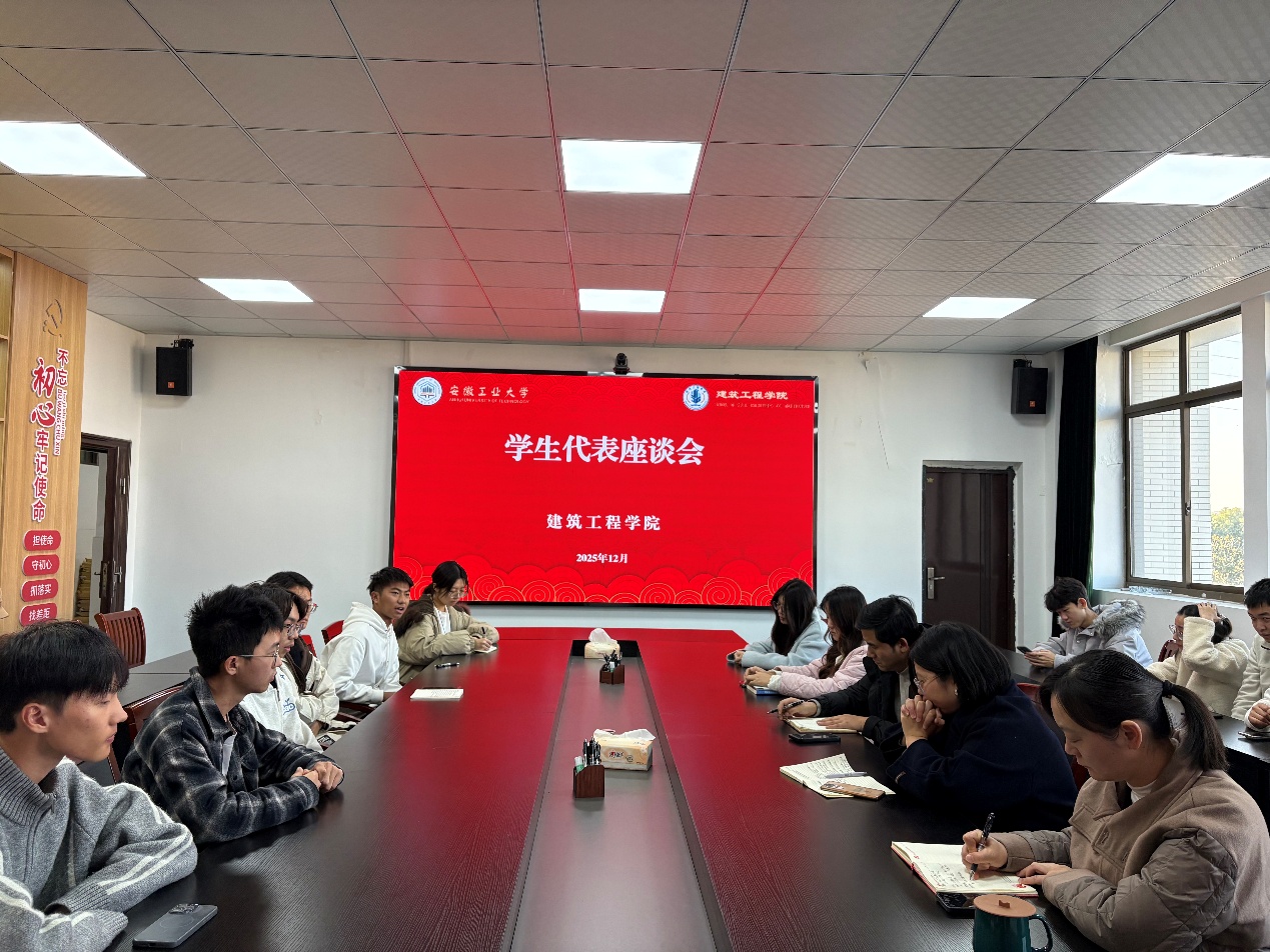 于建工北楼310会议室组织召开2025-2026学年第一学期期中教学学生座谈会。学院教学督导组老师,各年级辅导员、学生代表参加。学院团委副书记、2024级辅导员朱珉琨主持会议。