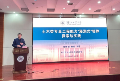 浙江省杰青、浙江省中青年学科带头人、浙江工业大学土木工程学院副院长付传清教授作了题为《土木类专业工程能力“浸润式”培养探索与实践》的报告,报告从地方高校土木类人才工程能力培养的角度,介绍学院在提升人才培养质量和实践能力方面的一些探索与实践。