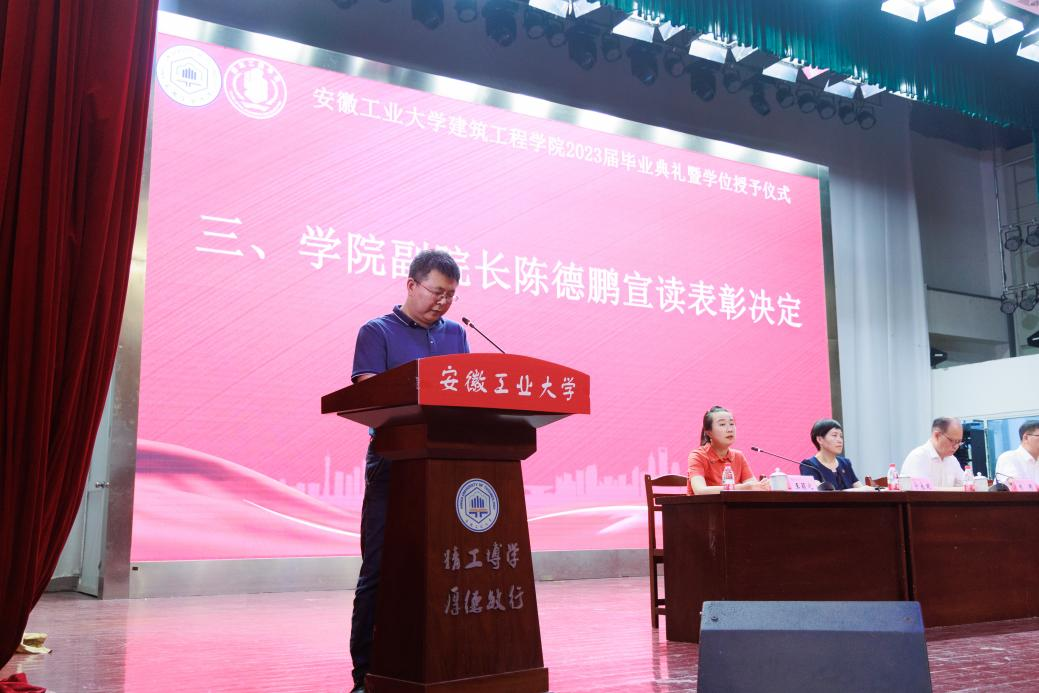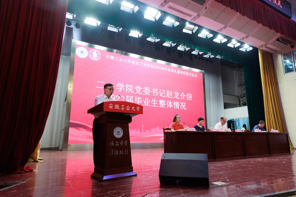 党委书记赵龙介绍了学院2023届毕业生整体情,副院长陈德鹏宣读了2023年安徽省普通高等学校优秀毕业生、校优秀毕业生、毕业生考取研究生录取率优秀班级、校友联络员名单。