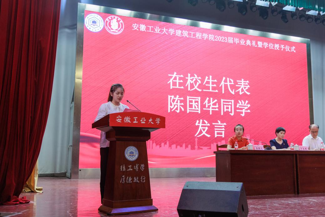 典礼上,本科生代表2018级建筑学专业黄泽辉同学回顾了在工大五年的求学时光,积极践行“今天我以母校为荣、明天母校以我为荣”的青春誓言,努力书写精彩人生华章。研究生代表2020级冶金环境安全工程专业胡俊杰同学结合自身在工大校园学习、科研的时光表达对于母校的热爱之情。留学生代表ALI ABDULRAHMAN FARID由衷感谢母校的培养,在学习过程中学会了勇敢与坚强、自信与务实。在校生代表2020级建筑学专业本科生陈国华向即将毕业的学长学姐们给予的帮助表达了感谢,并表述将努力用自身的青春和智慧续写辉煌的篇章。毕业生家长代表黄世胜先生向学校及学院老师辛勤付出致以崇高的敬意和最诚挚的感谢,衷心祝愿学校及学院发展越来越好。教师代表陈德敏老师在发言中回顾了毕业生在校学习的点点滴滴,积极鼓励毕业生们以“积跬步致千里”的追求,以全新的姿态适应人类社会发展需求。