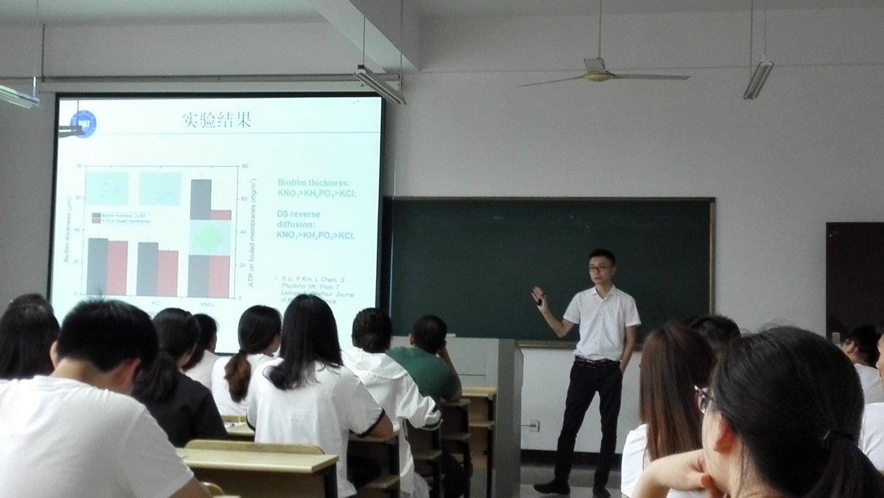 报告会上,黎晟首先介绍了正渗透的原理、特点、应用、存在的问题以及国际研究进展;随后详细报告了化肥驱动型正渗透——无土栽培灌溉的小试、中试及应用研究工作,探究了化肥驱动型正渗透对生活污水污染物的去除效果、膜污染物的形成以及膜污染的控制机理。报告内容丰富,专业学术性强,对我校师生拓宽学术思维和学习专业前沿知识具有积极意义。报告结束后,师生积极提问,交流气氛热烈。